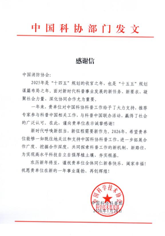 近日,中國科協(xié)向我會(huì )發(fā)來(lái)感謝信,對我會(huì )過(guò)去一年里對科普工作的傾情支持與積極助力表示感謝,并展望2026年深化合作新圖景。